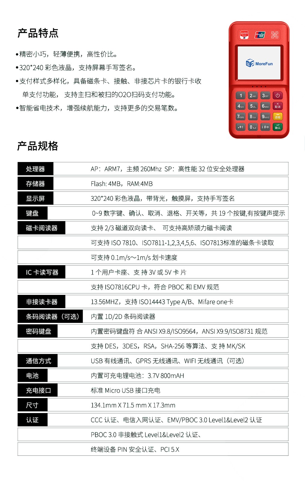 首页>>产品中心>>手持无线POS 钱宝支付-4G+扫码枪 高配版 * 性能优越:32位高性能ARM11安全CPU;整机通过业内更先进的PCI PED4.X 安全认证及国内受理终端PIN输入设备安全评估检测认证,多项措施保障金融交易的安全;* 时尚外观:外形小巧携带方便,高抗跌落性能、宽工作温度、防水防尘设计、外壳坚固耐刮、户外携带式作业更加耐久可靠。* 通讯备份:支持2G-3G扩展;* 超长续航:3.7V-800毫安稳定续航能力,智能电池管理保证持续工作18小时,待机72小时。 标准配置 返 回